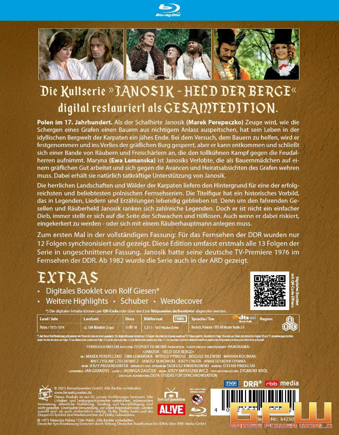 Mit der Janosik, Held der Berge (Janosik) - Box bekommen wir dank Fernsehjuwelen alle 13 Folgen der Abenteuerserie mit Marek Perepeczko als Janosik und Ewa Lemanska als Maryna, jetzt erstmals ungekürzt als Neuauflage auf DVD und erstmals in HD auch auf Blu-ray zu sehen.