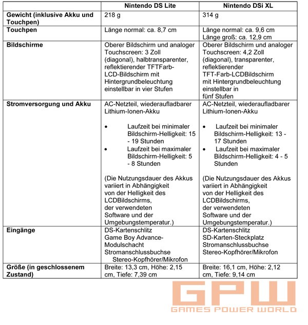 • Größere Bildschirme: Die Bildschirmdiagonale verlängert sich beim Nintendo DSi XL auf 4,2 Zoll. Damit ist die Fläche seiner Displays um 93% größer als die der 3-Zoll-Bildschirme des Nintendo DS Lite. Auch der Betrachtungswinkel vergrößert sich. Das dürfte vor allem bei den Nintendo-Fans gut ankommen, die gern zusammen mit anderen spielen und sich gegenseitig über die Schulter schauen möchten. Die Auflösung bleibt mit 256x192 Pixeln unverändert. • Größere Abmessungen: Der Nintendo DSi XL ist höher und breiter als der reguläre Nintendo DSi. Seine neuen Dimensionen machen ihn lediglich um 96 Gramm schwerer. Außerdem verfügt er über zwei vergrößerte Touchpens: einer ist extra groß und hat die Form eines Kugelschreibers. Das macht die Konsole bequemer zu bedienen. • Längere Laufzeit: Je nach gewählter Helligkeitsstufe garantiert der Nintendo DSi XL bis zu 17 Stunden ununterbrochenen Spielspaß. Der Nintendo DSi läuft unter gleichen Bedingungen maximal 14 Stunden. • Vorinstallierte Software: Auf dem Nintendo DSi XL sind bereits drei Programme vorinstalliert: die Nintendo DSiWare-Titel „Dr. Kawashimas Gehirn-Jogging ™ für zwischendurch: Wortspiele“ und „Wörterbuch 6 in 1 mit Kamera-Funktion“ sowie der Nintendo DSi-Browser, mit dem der Nutzer bequem im Internet surfen kann. Selbstverständlich verfügt der Nintendo DSi XL über alle Funktionen des originalen Nintendo DSi. So kann der Nutzer mit ihm Fotos erstellen, diese bearbeiten und an seine Freunde schicken, seine Lieblingsmusik hören und damit experimentieren sowie Spiele aus dem Nintendo DSi Shop herunterladen. Technische Details im Vergleich: |