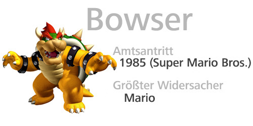Bowser, der böse Koopa-König, ist der Erzfeind von Mario. Bowser entführt gerne Prinzessin Peach Toadstool, um über das Pilz-Königreich zu herrschen; wobei es Mario immer wieder gelingt, die Prinzessin zu befreien.