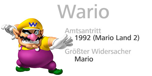 Wario ist eine übergewichtige, wenngleich sehr muskulöse und rotnasige Karikatur eines italienischen Schurken, wobei sein Design auf dem Aussehen Marios basiert. Dieses wurde so abgewandelt, dass aus dem Helden, den Mario verkörpert, eine Antihelden-Figur wurde.