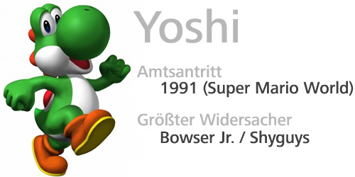 Yoshi ist Marios Freund und Reittier, das erstmals in Super Mario World für das Super Nintendo, auftauchte. Yoshi wurde von Shigefumi Hino, einem Grafikdesigner (und späteren Entwicklungsleiter von Pikmin) erschaffen. Der Grund für diese Schöpfung war der Umstand, dass Nintendos Designerteam, kurz nachdem Shigeru Miyamoto das Spiel Super Mario Bros. fertiggestellt hatte, Mario auf einem Dino reiten lassen wollte. Dieses Konzept war bis zur Entwicklung des SNES technisch nicht realisierbar.