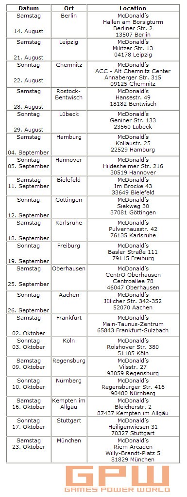 Pokémon Day Tour 2010 startet im August Für kleine und große Nintendo-Fans - für Kinder wie für ihre Eltern - gehört sie seit Jahren zum Freizeitprogramm: die Pokémon Day Tour. Vom Auftakt in Berlin am 14. August bis zum großen Finale in München am 23. Oktober tourt sie durch 20 Städte in ganz Deutschland. Dort verwandelt sie die Plätze vor McDonald's Restaurants und zahlreichen Malls wieder in farbenfrohe Bühnen und Wettkampfarenen. Nintendo erwartet viele Besucher, die sich auf ein buntes Show-Programm freuen dürfen, moderiert von dem beliebten Sänger und Schauspieler Oli Petszokat. Geboten werden ein Pokémon-Parcours, Gewinnspiele, Wettbewerbe und vieles mehr. Zum letzten Mal mit dabei: Der knallgelbe Pokémon-Bus, von dem sich die Fans mit einer Charity-Aktion verabschieden können. "Mir macht es immer wieder von Neuem Spaß, die Pokémon Days zu moderieren", sagt Oli Petzsokat. "Es ist einfach schön zu sehen, wie Kinder und Erwachsene zusammen einen lustigen Samstag- oder Sonntagnachmittag verbringen." Das Familien-Event findet immer an Wochenenden von 12 bis 18 Uhr statt. Dabei dreht sich natürlich alles um Pokémon, die lustigen Fantasiewesen aus den Videospielen von Nintendo und den Sammelkartenspielen von AMIGO. Beide Spielarten können die Besucher nach Herzenslust ausprobieren, darunter auch die brandneuen Versionen Pokémon Goldene Edition HeartGold und Pokémon Silberne Edition SoulSilver. Darüber hinaus wird es wieder einen Parcours-Wettbewerb geben, der in diesem Jahr um eine von den Pokémon-Fans selbst gestaltete und ausgewählte Station erweitert wurde. Seit je her mit dabei - und eine Art Maskottchen der Pokémon Day Tour - ist der knallgelbe Pokémon-Bus. Nun ist er in die Jahre gekommen und wird von einem silberglänzenden Pokémon-Caravan abgelöst. Aber 2010 hat er noch einen letzten Auftritt, bei dem die Pokémon-Freunde Abschied von ihm nehmen können. Jeder darf sich mit Lackstiften auf seiner Karosserie verewigen und ist eingeladen, an einer Spendenaktion für die McDonald's Kinderhilfe Stiftung teilzunehmen. Die McDonald's Kinderhilfe baut und unterhält Häuser in der Nähe von Kliniken, in denen die Familien während der Behandlung ihrer schwer kranken Kinder ein Zuhause auf Zeit finden. Am Ende der Pokémon Day Tour wird der traditionelle amerikanische Schulbus nicht verschrottet, sondern - ebenfalls zugunsten der Stiftung - versteigert. Jede Menge Spielspaß, Entertainment und obendrein die Möglichkeit, Kindern etwas Gutes zu tun - da sollte sich jeder Nintendo-Fan den Pokémon Day in seiner Stadt schon einmal im Kalender anstreichen. Wann und wo die Tour Station macht, erfährt man auf der Seite www.nintendo.de.