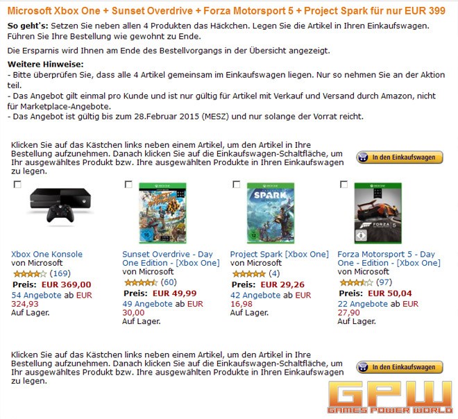 amazon Xbox One - Angebot Microsoft Xbox One + Sunset Overdrive + Forza Motorsport 5 + Project Spark für nur EUR 399 So geht's: Setzen Sie neben allen 4 Produkten das Häckchen. Legen Sie die Artikel in Ihren Einkaufswagen. Führen Sie Ihre Bestellung wie gewohnt zu Ende.