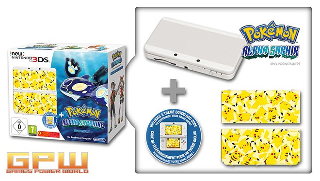 New Nintendo 3DS + Pokémon Alpha Saphir Pack Die jüngeren Nintendo-Freunde, insbesondere die Pokémon-Fans unter ihnen, dürfen sich auf das New Nintendo 3DS + Pokémon Alpha Saphir Pack* freuen. In ihm ist eine weiße Konsole mit einer digitalen Version des Spiels enthalten, Design-Cover in Weiß und zusätzlich mit Pikachu-Motiv sowie ein Download Code für das Home Menü-Design Pokémon: Pikachu Party. Ob sie die Sommerferien 2015 zuhause oder auf Reisen verbringen – Langeweile brauchen die Nintendo-Fans in keinem Fall zu fürchten. Denn dank der drei New Nintendo 3DS-Bundles ist das nächste Abenteuer ab 26. Juni immer nur einen Tastendruck entfernt.