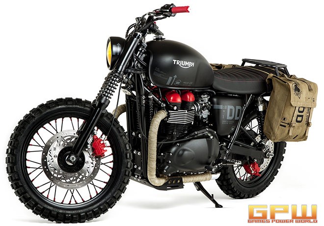 Da die Maschine des Anführers der Diamond Dogs in Metal Gear Solid V: The Phantom Pain die Erfordernisse des zivilen Straßenverkehrs nicht beachten muss, wurden Außenspiegel, Tachometer und Drehzahlmesser von ihrer funktionsgebenden Form gelöst. Die so umgewandelte T100 Bonneville wurde zum ultimativen Hot Rod weiterentwickelt. Dank der benutzerdefinierten Felgen und der Bestückung mit TKC80er Continental-Reifen werden Off-Road-Abenteuer mit der ‘Venom’ mit Bravour gemeistert. Der in Schlangenleder-Optik gehaltene Sattel besteht aus Neopren und Carbon und erinnert an Snakes kultigen Kampfanzug. Die Rückseite des Sattels wurde mit einer zusätzlichen Munitionstasche umhüllt, die sowohl Schutz als auch zusätzliche Kapazitäten für ein oder zwei Kisten Kaliber .50 Munition bietet. Ein vergilbter JVB Rumbler Scheinwerfer und externe Schwerlastgabelfedern sorgen für eine aggressive Anmutung der Front, während das Motorrad im Profil durch das Fehlen der vorderen Kotflügel zugespitzt wirkt. Das verkürzte Schutzblech und das ausrufungszeichenförmige Rücklicht tragen ihrerseits zur Individualität der Maschine bei. Die farblich aufeinander abgestimmten Felgenbremsen und Ventilhauben sind weitere Details, die ins Auge stechen, während der Splash-Cut-Auspuff den Soundtrack liefert, der alle Blicke auf sich zieht. Details wie die Triumph Tiger Off-Road-Fußrasten, das Renthal Hochleistungs-Kettenrad, die bearbeiteten Drosselklappengehäuse sowie die Triumph Sport-Schalthebel tragen allesamt zur Einzigartigkeit dieses Motorrades bei. Eine strapazierfähige, schablonierte Diamond Dogs Lackierung in Matt-Schwarz vereint Fahrer und Fahrzeug und vollendet die Bonneville, die in ihrem Look einem Snake gerecht wird. Die VTB: 1 / Venom Triumph Bonneville wurde vom 22.bis 24. Mai auf der London MCM Comic Con enthüllt und wird auf einer Reihe weiterer Veranstaltungen über das ganze Jahr zu besichtigen sein.