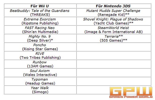 Indie-Spiele am Nintendo-Stand auf der gamescom * Mighty No. 9 erscheint auch für Nintendo 3DS und wird im Handel erhältlich sein. ** Der Plague of Shadows DLC für Shovel Knight sowie für Mutant Mudds Super Challenge und Terraria erscheinen auch für Wii U. Terraria wird auch im Handel erhältlich sein