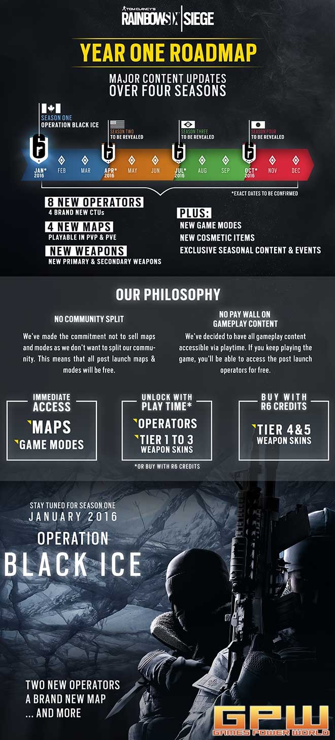 Tom Clancy’s Rainbow Six Siege Düsseldorf, 6. November 2015 – Ubisoft gibt bekannt, welche Pläne die Entwickler für Rainbow Six Siege nach der Veröffentlichung haben und auf welche neuen Inhalte sich die Spieler freuen dürfen. Eine Roadmap, die die neuen Informationen auf einen Blick zusammenfasst, befindet sich unten in dieser News-Meldung.