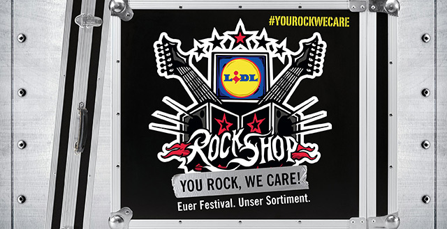 Damit sich auch 2016 alle Musikfans bei Deutschlands größtem Rockfestival Rock am Ring 2016 voll aufs Festivalerlebnis konzentrieren können, sorgt der Lidl-RockShop wieder für volle Regale - von frischem Obst über gut gekühltes Bier bis hin zu Steaks und frischen Brötchen. Somit können alle Festivalgänger wieder direkt auf dem Campinggelände bequem zu Lidl-Preisen einkaufen. Wie schon in den Jahren zuvor lässt der RockShop keine Wünsche offen: Das festivaltaugliche Sortiment umfasst etwa 160 Artikel und die 100 Personen zählende Lidl-Crew lässt sich durch nichts aus der Ruhe bringen. Der RockShop 2016 - die Full-Service-Festivalfiliale Getreu dem Motto "You rock, we care. Euer Festival, unser Sortiment." bietet Lidl 2016 auch Entertainment rund um das Einkaufen an. Vor dem RockShop können sich Festivalgänger wieder auf Limbo-Challenges, Give-aways und Schutz vor Sonne, Regen, Wind und Wetter freuen. Während dem Einkauf wartet die "RockShop-Bäckerei" mit einer Sitzecke und Kaffeeautomaten auf die RockShopper. Abgerundet wird das Einkaufserlebnis durch eine "Chillout-Zone" mit DJ, in der erschöpfte Festivalgänger sowohl ihre eigenen Akkus als auch an einer Ladestation ihre Handyakkus aufladen können. Der RockShop 2016 in Zahlen Im Vergleich zu den Vorjahren wird der RockShop nochmals optimiert, um allen Musik- und RockShopfans ein noch besseres Einkaufserlebnis bieten zu können. Auf einer Grundfläche von knapp 3.000 qm warten mehrere hundert Regalmeter an Waren und 18 Kassen auf die Festivalgänger. Und auch an die Leergutrücknahme ist mit 6 Pfandautomaten gedacht. Abgerundet wird der RockShop-Auftritt durch spezielle Branding-Maßnahmen, die die Kernbotschaft "You rock, we care. Euer Festival, unser Sortiment." transportieren werden.