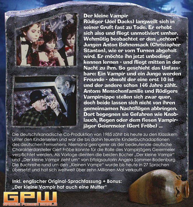 Der kleine Vampir ist seit dem 12. Dezember 2014 Erlebe in Der kleine Vampir die spannende Geschichte von Anton Bohnensack (Christopher Stanton), den Vampiren Rüdiger (Joel Dacks), Anna (Marsha Moreau), Lumpi (Jim Gray), Tante Dorothee (Lynn Seymour), Onkel Theodor (Michael Gough) und den Vampirjäger Herr Geiermeier (Gert Fröbe). Der kleine Vampir ist eine weitere Serie die in keiner Sammlung der 80er fehlen darf. >> Der kleine Vampir [2 DVDs] hier kaufen << Produktinformation