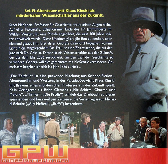 Scott McKenzie, Professor für Geschichte, traut seinen Augen nicht. Auf einer Fotografie, aufgenommen Ende des 19. Jahrhunderts im Wilden Westen, ist eine Pistole abgebildet, die erst 100 Jahre später entwickelt wurde. Diese Unstimmigkeit gibt ihm zu denken, aber niemand glaubt ihm. Erst als er Georgia Crawford begegnet, kommt Licht in die Angelegenheit: Die Frau ist eine Zeitreisende, die auf der Jagd nach Dr. Cole (Klaus Kinski) ist. Dieser ist ein Wissenschaftler aus der Zukunft, der aus dem Jahr 2586 zurückreist, um den Lauf der Geschichte zu verändern. Georgia will dies gemeinsam mit McKenzie verhindern. Gemeinsam begeben sie sich ins Jahr 1886 zurück ... Die Zeitfalle ist eine packende Mischung aus Science-Fiction-, Abenteuerfilm und Western, in der Paradebösewicht Klaus Kinski mit Bravour einen mörderischen Professor aus der Zukunft spielt. Kein Geringerer als Brian Clemens (Mit Schirm, Charme und Melone, Thriller, Die Profis) schrieb das Drehbuch zu dieser spannenden und kurzweiligen Zeitreise, die Serienregisseur Michael Schultz (Ally McBeal) inszenierte.