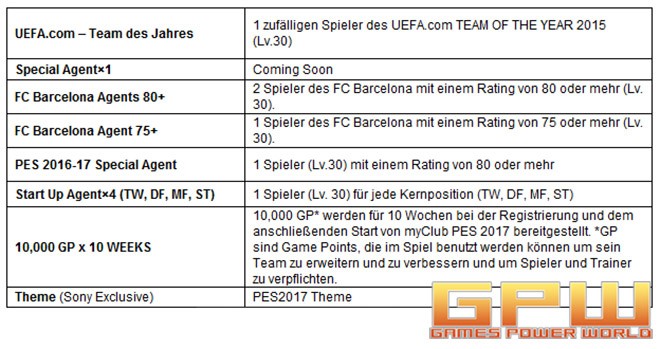 Neben den 30 bereitgestellten Teams hat KONAMI sowohl mit dem Klub Atlético River Plate und mit Atlético Independiente eine exklusive Partnerschaft für PES 2017 vereinbart. KONAMI wird alle aktuellen Trikots und Symbole der Mannschaften abbilden, ebenso wie das offizielle Stadion von River Plate, das El Monumental. Atlético River Plate ist der argentinische Klub mit den meisten nationalen Titeln – 44 Titel in der Primera División und 2 in der Primera B Nacional. River Plate konnte ebenso 15 internationale, offizielle Titel gewinnen, was eine Gesamtzahl von 59 Titeln seit der Gründung im Jahre 1901 ausmacht. Darüber hinaus erhalten Spieler, die PES 2017 vorbestellen folgende Bonusinhalte: