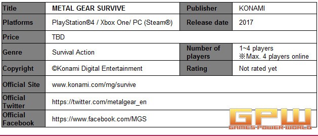 Die Gameplay Demo von Metal Gear Survive feiert ihr Debüt am Samstag, 17. September (16.15 Uhr Ortszeit; 9.15 Uhr in Deutschland) am KONAMI Stand. Dort präsentiert der Publisher weltweit erstmals Gameplay und neue Informationen zu dem Titel. Metal Gear Survive ist ein brandneuer, Koop-basierter Titel für bis zu vier Spieler, der auf der Welt und den Action-Elementen des gefeierten METAL GEAR SOLID V: THE PHANTOM PAIN (MGSV: TPP) basiert und davon inspiriert wurde. Die populären Stealth Elemente aus der METAL GEAR Serie werden durch neue Survival Elemente vertieft, die erstmals mit Metal Gear Survive eingeführt werden. Metal Gear Survive wird gegenwärtig von Teammitgliedern des MGSV:TPP Productions Teams entwickelt. Die Präsentation auf der KONAMI Bühne wird u.a. via YouTube live übertragen.