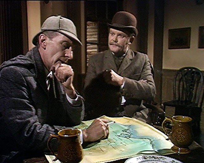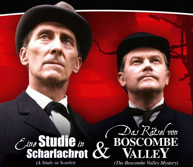 Sherlock Holmes (Peter Cushing) und Dr. Watson (Nigel Stock) ermitteln in EINE STUDIE IN SCHARLACHROT im mysteriösen Mordfall des Enoch J. Drebber, der vergiftet in einem verlassenen Haus aufgefunden wurde. An die Wand wurde mit Blut das deutsche Wort RACHE geschrieben. Ein goldener Ring führt Holmes auf die richtige Spur. DAS RÄTSEL VON BASCOMBE VALLEY bringt den Detektiv nach Herefordshire, wo James McCarthy seinen Vater im Streit erschlagen haben soll. Alles spricht gegen ihn, doch er beteuert seine Unschuld.