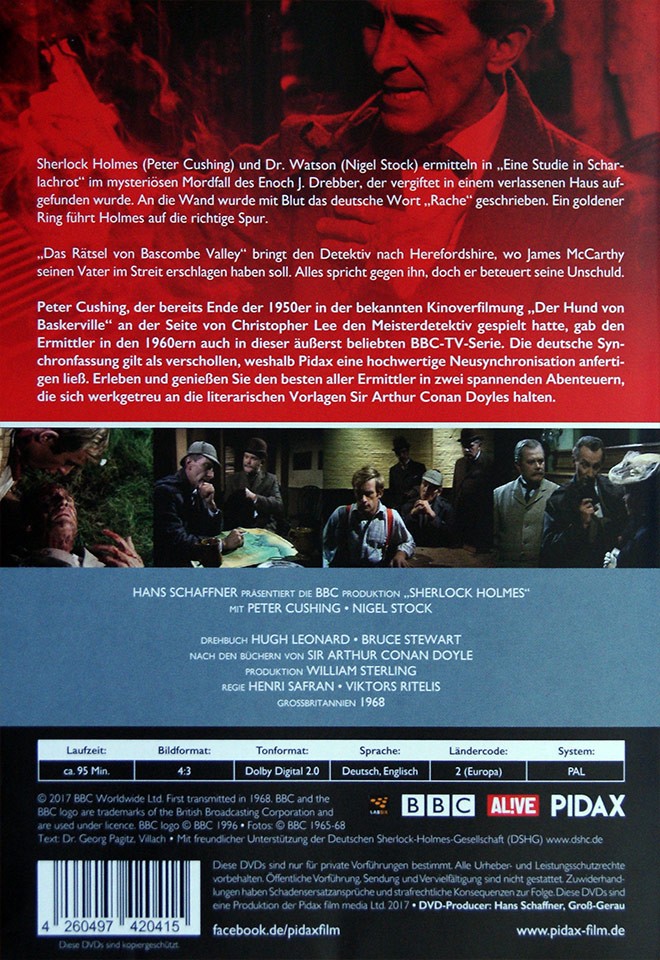Mehr zu Sherlock Holmes, Vol. 1 Sherlock Holmes ist die 29-tlg. englische Fernsehserie in zwei Staffeln die 1965 bis 1968 produziert wurden. Die zwei Folgen der Krimiserie mit Peter Cushing und Nigel Stock werden dank Pidax in der Reihe Pidax Serien-Klassiker ab den 21. Juli 2017 auf 1 DVD erhältlich sein und sind somit erstmals auf DVD zu sehen. Wohl nur zehn Folgen (dabei ein Zweiteiler) aus Staffel 2 dieser Serie, wurden in Deutschland das erste Mal ab 23. August 1969 bis 29. März 1970 in der ARD ausgestrahlt.