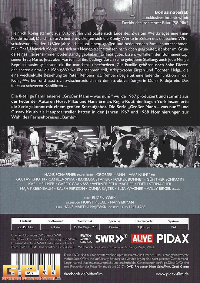 Mit der DVD-Box Großer Mann - was nun? bekommt ihr jetzt dank Pidax alle 8 Folgen der Familienserie von 1967/68 das erste Mal auf DVD zu sehen. Es gibt wieder einige Stars dieser Zeit zu sehen, wie z.B. Gustav Knut, Camilla Spira, Günther Schramm, Dunja Rajter, Willy Birgel u.v.a.