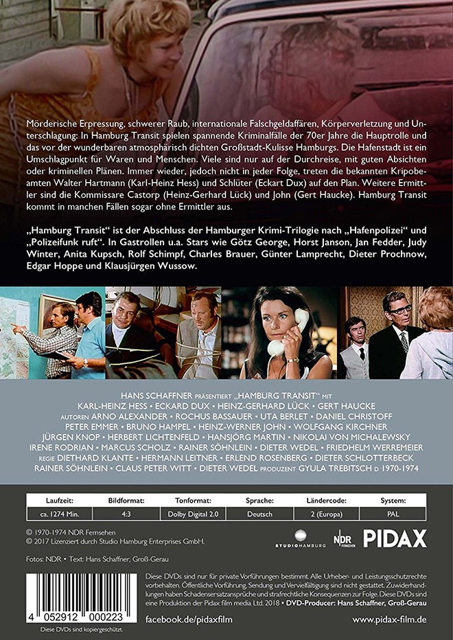 Mit der DVD-Box von Hamburg Transit bekommen wir alle 52 Folgen der Kultserie mit Karl-Heinz Hess, Eckard Dux, Heinz-Gerhard Lück, Gert Haucke, Götz George, Klausjürgen Wussow, Horst Janson, Arthur Brauss, Jan Fedder, Karl-Michael Vogler, Willi Semmelrogge und vielen weiteren bekannten Darstellern der 70er auf 7 DVDs zu sehen.