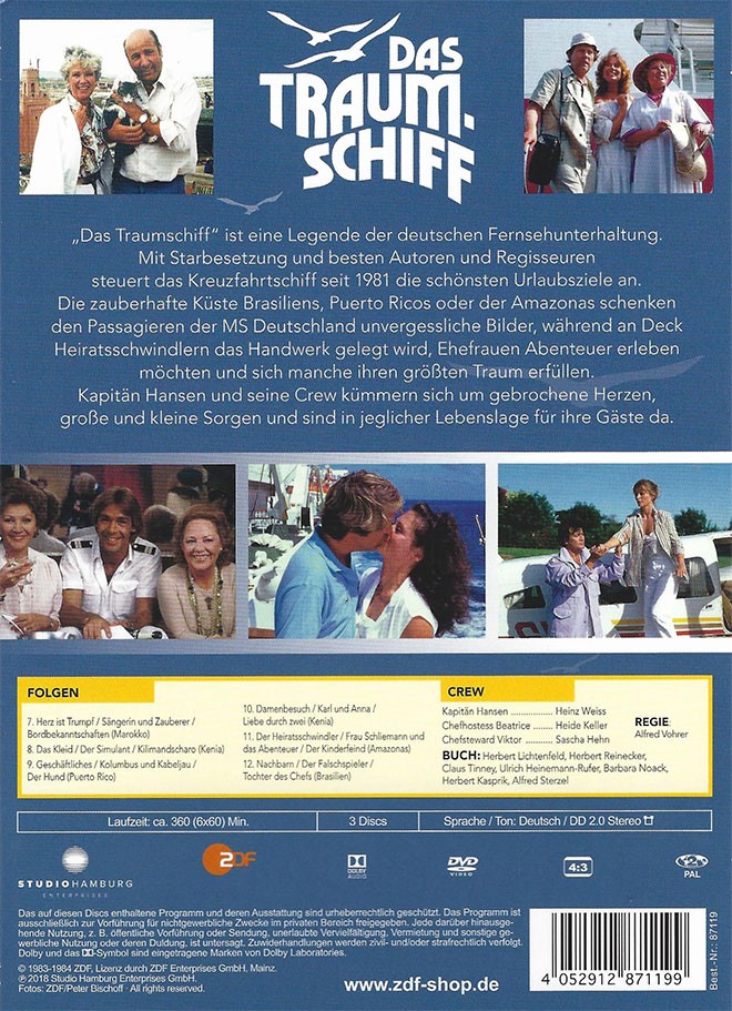 Mit Das Traumschiff - Box 2 bekommen wir die Folgen 7 bis 12 der Familienserie auf 3 DVDs. In diesen Folgen sind als Hauptdarsteller Heinz Weiss als Kapitän Heinz Hansen, Sascha Hehn als Chefsteward Victor Burger und Heide Keller als Chefhostess Beatrice von Ledeburzu sehen.