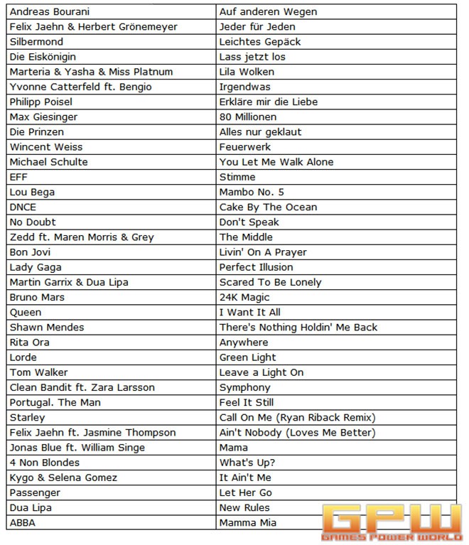 Die Songliste umfasst insgesamt 35 Tracks. Mit dabei sind Künstler wie Andreas Bourani mit “Auf anderen Wegen”, Wincent Weiss mit “Feuerwerk”, Max Giesinger mit “80 Millionen” und Silbermond mit “Leichtes Gepäck”. Durch diese Vielfalt bietet Let’s Sing 2019 für jeden Superstar das Richtige. Aber das ist längst nicht alles: Mit dabei sind auch echte Evergreens, Klassiker und Gassenhauer wie ABBA mit “Mamma Mia”, Shawn Mendes mit “There's Nothing Holdin' Me Back”, EFF mit “Stimme” und viele mehr.