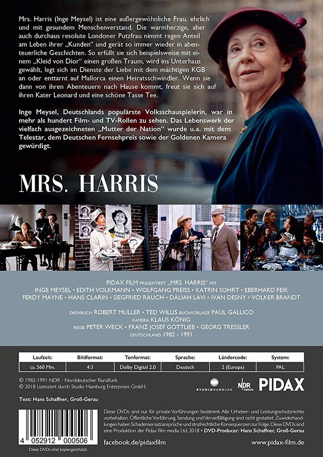 Mit Mrs. Harris - Die Abenteuer einer Londoner Putzfrau bekommen wir den großen Publikumserfolg in 6 Folgen mit Inge Meysel, Eberhard Feik, Hans Clarin, u.v.a. Darstellern der 80er und 90er auf 6 DVDs zu sehen.