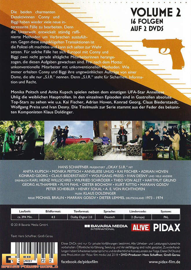 Ihr bekommt mit Okay S.I.R. - Vol. 2 dank Pidax die letzten 16 Kriminalfälle der internationalen Polizeibehörde Europol aus Brüssel, mit den Hauptdarstellern Anneliese Uhlig als S.I.R., Anita Kupsch als Bigi und Monika Peitsch als Conny erstmals auf 2 DVDs zu sehen.