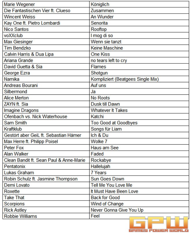 Im Spiel werden 35 deutsche und internationale Songs zur Verfügung stehen! Mit dabei sind Interpreten wie Die Fantastischen Vier ft. Clueso mit “Zusammen”, Silbermond mit “Ja”, Max Giesinger mit “Wenn sie tanzt”, Andreas Bourani mit “Auf uns”, Alice Merton mit “No Roots”, Ariana Grande mit “no tears left to cry” und Imagine Dragons mit “Whatever It Takes” und viele mehr!