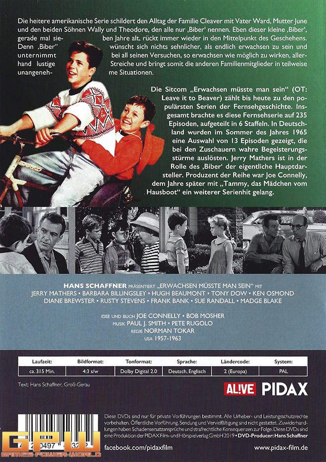 Mehr zu Erwachsen müsste man sein Erwachsen müßte man sein (Leave It To Beaver) ist die 234-teilige US-Sitcom und ein Pilotfilm von Joe Connelly und Bob Mosher, die 1957 bis 1963 in sechs Staffeln produziert wurde. Dank Pidax wird Erwachsen müsste man sein mit allen 13 deutsch synchronisierten Folgen in der Reihe Pidax Serien-Klassiker am 5. April 2019 auf 2 DVDs veröffentlicht. Diese 13 Folgen von Erwachsen müsste man sein wurden bei uns in Deutschland das erste Mal vom 21. Mai 1965 bis 13. August 1965 im ZDF ausgestrahlt und wohl nur noch einmal ab Oktober 1966 bis Februar 1967 im ZDF wiederholt.
