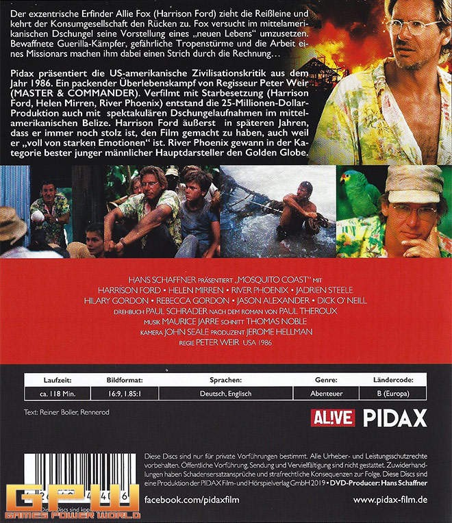 Mosquito Coast (The Mosquito Coast) Mosquito Coast auf DVD und Blu-ray von Pidax ist ab 1. April 2019 im Handel erhältlich. Dank Pidax bekommen wir jetzt die Preisgekrönte Romanverfilmung Mosquito Coast (The Mosquito Coast) mit Harrison Ford, Helen Mirren und River Phoenix von 1986 auf DVD und Blu-ray zu sehen.