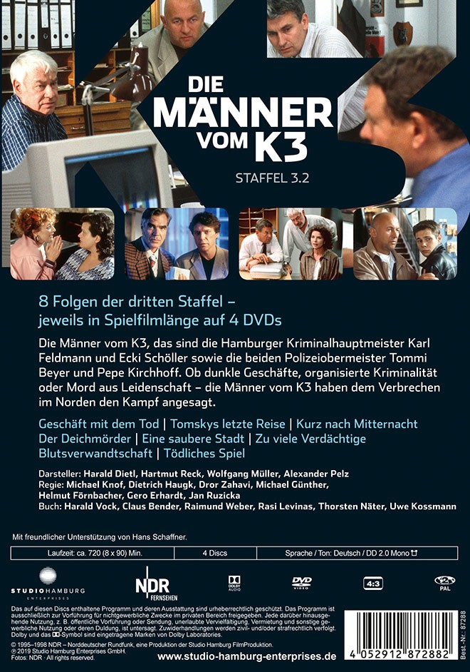 Mehr zu Die Männer vom K3 - Staffel 3.2 Die Männer vom K3 ist die 38 tlg. dt. Krimiserie in 3 Staffeln die von 1988 bis 2003 produziert wurde. Mit Die Männer vom K3 - Staffel 3.2 bekommen wir dank Studio Hamburg die nächsten 8 Folgen der Staffel 3 dieser Krimireihe ab 09. August 2019 auf 4 DVDs. Die Serie war bei uns in Deutschland das erste Mal vom 24. September 1988 bis 6. April 2003 in der ARD zu sehen. Die Männer vom K3, das sind die Hamburger Kriminalhauptmeister Karl (Kalle) Feldmann (Harald Dietl) und Ecki Schöller (Hartmut Reck) sowie die beiden Polizeiobermeister Tommi Beyer (Wolfgang Müller) und Pepe Kirchhoff (Alexander Pelz). Ob dunkle Geschäfte, organisierte Kriminalität oder Mord aus Leidenschaft – Die Männer vom K3 haben dem Verbrechen im Norden den Kampf angesagt.