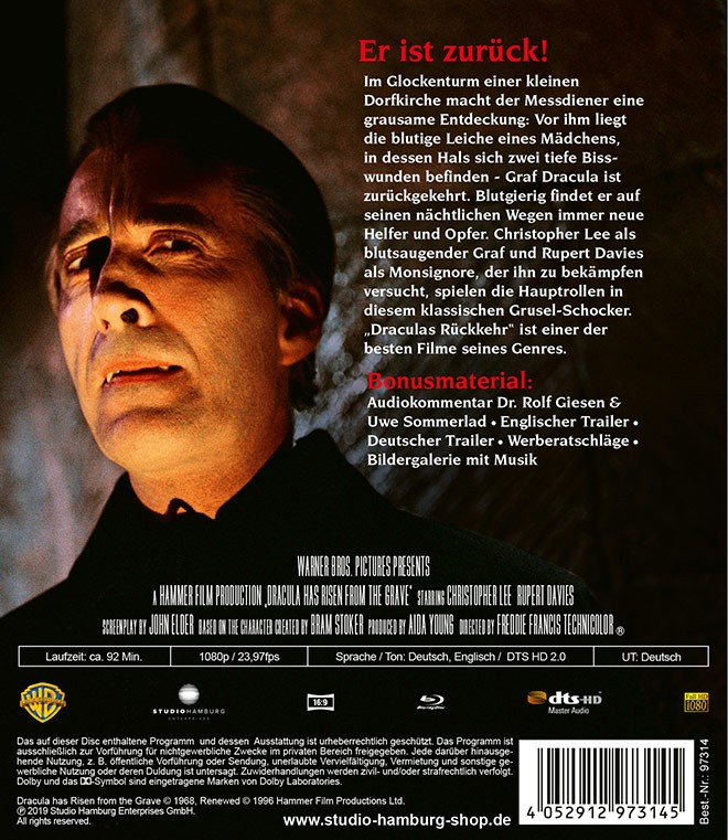 Draculas Rückkehr (Dracula Has Risen from the Grave) Draculas Rückkehr ist seit 27. September 2019 vom Studio Hamburg im Handel erhältlich. Mit dieser Draculas Rückkehr (Dracula Has Risen from the Grave) - Box bekommen wir wieder Christopher Lee als Graf Dracula und Rupert Davis als Monsignore Ernst Müller in einer Neuauflage auf Blu-ray zu sehen. >> Draculas Rückkehr (Blu-ray) hier kaufen << Produktinformation