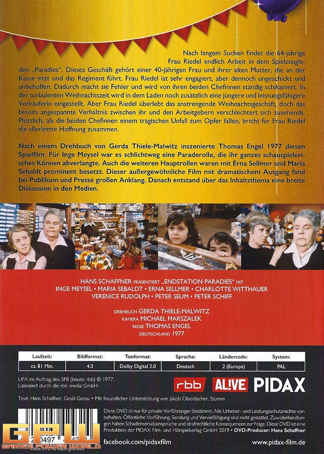 Endstation Paradies Endstation Paradies auf DVD von Pidax ist ab 8. November 2019 im Handel erhältlich. Mit der Endstation Paradies - Box bekommen wird dank Pidax ein außergewöhnliches Filmdrama von 1977 mit Inge Meysel als Frau Riedel, Erna Sellmer als Mutter Wagenknecht und Maria Sebaldt als Frau Wagenknecht jetzt erstmals auf DVD zu sehen. >> Endstation Paradies (DVD) hier kaufen << Produktinformation: