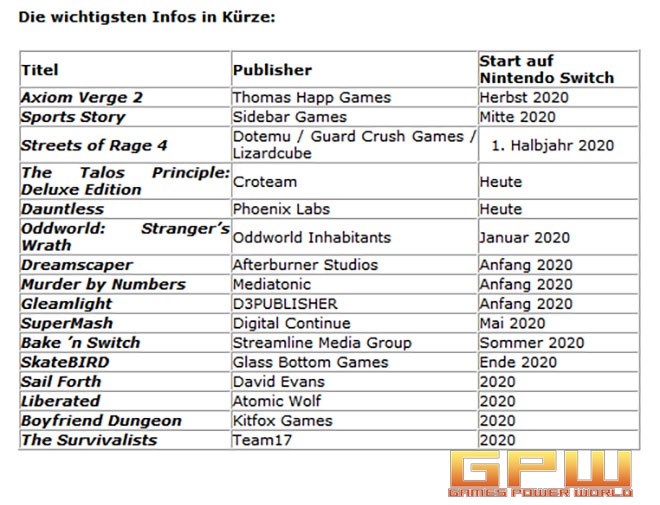 Die aktuelle Indie World-Präsentation steht auf YouTube bereit. Weitere Informationen zu den Spielen gibt’s auf dem Indie World-Portal auf der offiziellen Nintendo-Website. Die Highlights der aktuellen Indie World-Präsentation: Axiom Verge 2 von Thomas Happ Games ist die Fortsetzung des hochgelobten Indie-Hits. Die SpielerInnen erforschen darin die Ursprünge des Axiom Verge-Universums. Im Herbst 2020 brechen sie mit Nintendo Switch zu ihrer Entdeckungsreise auf. Sports Story von Sidebar Games stammt von den Schöpfern von Golf Story. Sie haben ein neues Abenteuer voller Golf und Tennis, aber auch Dungeons, Minispielen und Spionage kreiert, in dem SpielerInnen sowohl Freund als auch Feind begegnen. Ab Mitte 2020 heißt es exklusiv auf Nintendo Switch: Sport frei! Dauntless von Phoenix Labs lädt dazu ein, sich den Millionen Fans der rasant wachsenden Community des Online-Action-Rollenspiels anzuschließen. Dank Crossplay-Möglichkeit durchstreifen sie auch mit MitspielerInnen, die auf anderen Systemen als Nintendo Switch spielen, eine riesige, kostenlos zugängliche Online-Welt. Dort kämpfen sie mit FreundInnen aus der ganzen Welt gegen gewaltige Behemoths. Exklusiv für Nintendo Switch gibt es das Himmelsstreiter-Rüstungsset und das Himmelsmetall-Waffenset. Die kosmetischen Pakete enthalten Skins für alle sieben Waffentypen sowie ein schickes Rüstungsset. Die Jagd in Dauntless geht schon heute los! The Talos Principle: Deluxe Edition von Croteam: Um mehr als 120 knifflige Rätsel zu lösen, gilt es, Drohnen umzuleiten, Laserstrahlen zu manipulieren und die Zeit zu beeinflussen. Auch The Talos Principle: Deluxe Edition ist bereits ab heute für Nintendo Switch erhältlich. The Survivalists von Team17 kombiniert das Sammeln und Herstellen von Gegenständen, den Bau von Basen und Survival-Elementen mit jeder Menge Überraschungen. Verwoben ist das Ganze in ein neues Abenteuer im Escapists-Universum. Auf Nintendo Switch können sogar bis zu vier SpielerInnen gemeinsam die Herausforderung annehmen, ob im lokalen oder im Online-Modus. Der Überlebenskampf in The Survivalists beginnt im Laufe des Jahres 2020. Streets of Rage 4 von Dotemu / Guard Crush Games / Lizardcube erweitert das klassische Prügelspiel-Gameplay der Streets of Rage-Trilogie mit zusätzlichen Mechaniken, einer neuen Geschichte und einer Vielzahl gefährlicher Schauplätze. Wenn Streets of Rage 4 in der ersten Jahreshälfte auf Nintendo Switch erscheint, wird es wieder jede Menge Hühnchen mit bösen Jungs zu rupfen – und zu futtern – geben. Gleamlight von D3PUBLISHER versetzt die SpielerInnen in der Rolle eines Schwerts (ganz genau: eines Schwerts) in eine wunderschöne Glasmalerei und lässt sie eine melancholische Geschichte erleben. Der neue Titel der Schöpfer von Bloodstained: Ritual of the Night wirft bereits Anfang 2020 sein magisches Licht auf Nintendo Switch. SkateBIRD von Glass Bottom Games lässt süße kleine Vögelchen auf Skateboards antreten. Ob sie über gebogene Strohhalme grinden, über den Tacker kickflippen oder durch einen Parcours aus Klebeband kurven – die Skatervögel geben immer ihr Bestes. Ab Ende 2020 können SkateBIRD-Fans auf Nintendo Switch aufs Board steigen. Bake 'n Switch von Streamline Media Group ist ein turbulenter Party-Spaß, in dem sich alles ums Essen dreht. Bis zu vier SpielerInnen müssen als Team Teig anrühren, kneten und etwas Leckers daraus backen, bevor die Zeit abläuft. Bake 'n Switch heizt ab Sommer 2020 den Nintendo Switch-Ofen an. SuperMash von Digital Continue ist eine Liebeserklärung an die Videospielkultur, in der die Betreibenden eines Videospiele-Ladens – Bruder und Schwester –eine mysteriöse Spielkonsole entdecken. Die SpielerInnen erwartet bei jedem Spielstart eine andere Erfahrung, denn SuperMash fasst verschiedene Spielgenres zusammen und beschert ihnen immer neue unerwartete Erlebnisse. Ab Mai 2020 wird SuperMash auf Nintendo Switch einiges durcheinander wirbeln. Sail Forth von David Evans ist ein mitreißendes Abenteuer auf hoher See, das klassische Segelkunst mit Entdeckerfreude kombiniert. Die Nintendo Switch-Matrosen erobern eine prozedural generierte Seekarte, auf der sie Inseln entdecken, Herausforderungen bewältigen, Seeleute retten und Piraten um ihre Schätze erleichtern. Sail Forth wirft 2020 Anker auf Nintendo Switch. Murder by Numbers von Mediatonic führt SpielerInnen in die Welt der Fernsehstudios und glitzernden Preisverleihungen. Dort müssen sie ein feinmaschiges Netz aus Verschwörung, Betrug und – natürlich – Mord aufdröseln, indem sie die Wahrheit Pixel für Pixel zusammensetzen. Untermalt wird das Spiel von der Musik von Masakazu Sugimori, dem Komponisten von Phoenix Wright: Ace Attorney und Viewtiful Joe. Murder by Numbers sorgt ab Anfang 2020 für spannende Unterhaltung und erscheint zeitexklusiv auf Nintendo Switch. Liberated von Atomic Wolf kombiniert Cyberpunk, handgezeichnete Graphic Novels, Interaktivität und Action zu einem nahtlosen Spielerlebnis. Die SpielerInnen blättern zwischen den Seiten und müssen sich schleichend, schießend und hüpfend in Side-Scrolling-Abschnitten beweisen. Währenddessen gilt es, stets alle Ereignisse aus unterschiedlichen Perspektiven zu betrachten, um die Wahrheit herauszufinden. Liberated startet 2020 zeitexklusiv auf Nintendo Switch. Boyfriend Dungeon von Kitfox Games ist eine Mischung aus Dating-Simulation und Dungeon-Crawler. Die SpielerInnen sammeln kostbare Erinnerungen mit vielen verschiedenen Herzensmenschen, um sich anschließend mit ihren individuellen Kampfstilen auf Monster zu stürzen und die Geheimnisse des Dungeons aufzudecken. Wenn Boyfriend Dungeon 2020 auf Nintendo Switch trifft, dürfte das der Beginn einer wunderbaren Freundschaft sein. Dreamscaper von Afterburner Studios: Um ein Problem zu lösen, muss man den Stier eben manchmal bei den Hörnern packen. Auch wenn das heißt, gegen eine alptraumhafte Depression im Unterbewusstsein einer jungen Frau anzuk