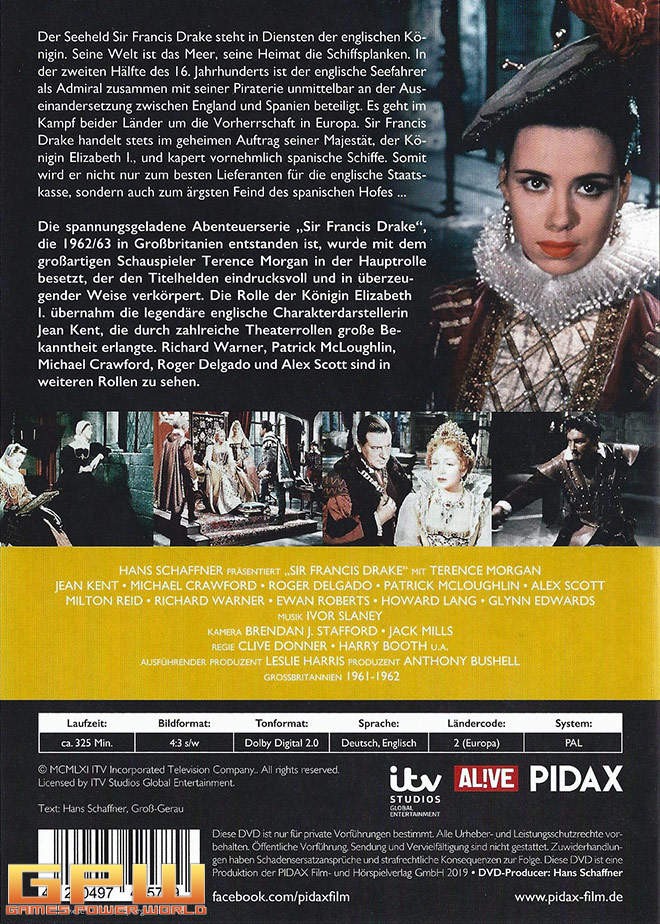 Sir Francis Drake - Der Pirat der Königin Sir Francis Drake - Der Pirat der Königin auf DVD von Pidax ist seit 6. Dezember 2019 bei Pidax und ab heute (24. Januar 2020) auch im Handel erhältlich. Ihr bekommt mit Sir Francis Drake - Der Pirat der Königin (The Adventures of Sir Francis Drake) dank Pidax jetzt die 13 deutsch synchronisierten Folgen der Abenteuerserie von 1961 bis 1962, mit Terence Morgan als Seeheld Sir Francis Drake und Jean Kent als Königin Elizabeth I. jetzt als Neuauflage auf 2 DVDs zu sehen. >> Sir Francis Drake (2 DVDs) hier kaufen << Produktinformation