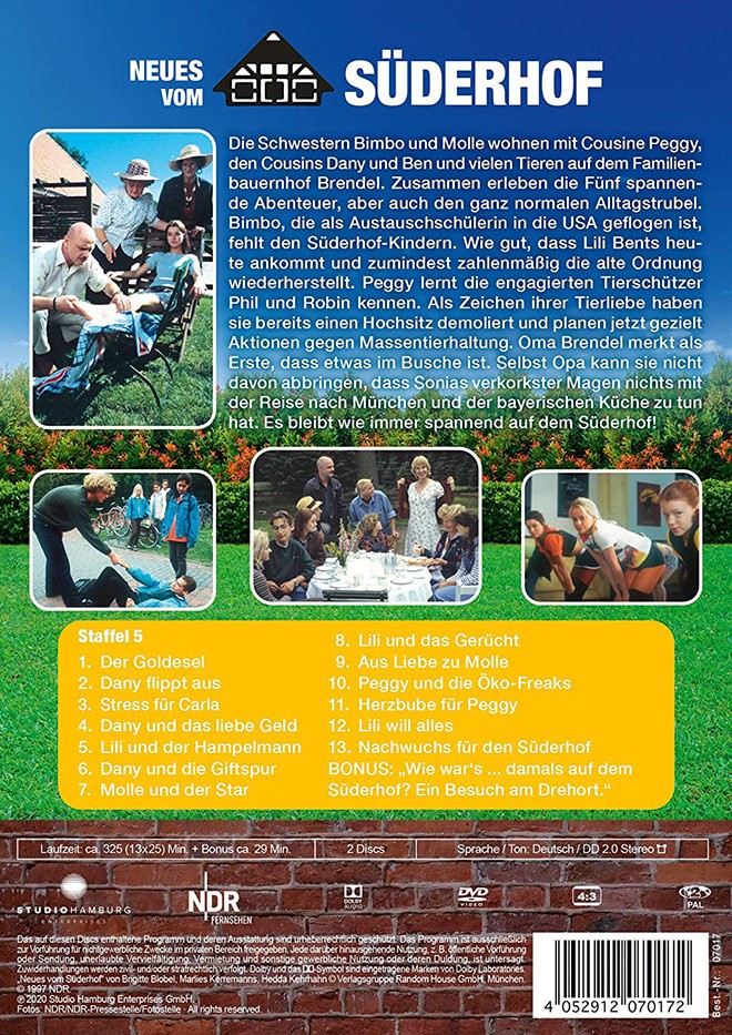 Neues vom Süderhof - Staffel 5 ("Süderhof II") Neues vom Süderhof - Staffel 5 ist ab 27. März 2020 vom Studio Hamburg im Handel erhältlich. Mit Neues vom Süderhof - Staffel 5 ("Süderhof II") bekommen wir die komplette Staffel 5 der Serie mit der Familie Brendel, die nach dem gleichnamigen Buch von Brigitte Blobel produziert wurde, jetzt erstmals auf 2 DVDs zu sehen. >> Neues vom Süderhof - Staffel 5 (2 DVDs) hier kaufen << Produktinformation