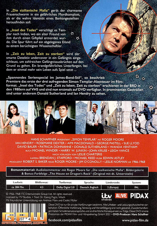 „Spannendes Serienspecial im James-Bond-Stil“, so beschrieb Premiere das erste der drei aufregenden Simon-Templar-Abenteuer im Filmformat. „Insel des Todes“ und „Zeit zu leben, Zeit zu sterben“ erschienen in der BRD in den 1980ern auf VHS und sind nun erstmals auf DVD verfügbar. In prominenten Gastrollen sind unter anderem Donald Sutherland und Ian Hendry zu sehen.