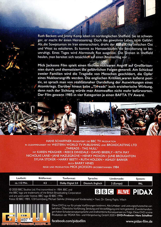 Threads - Tag Null Threads - Tag Null auf DVD von Pidax ist seit 31. Januar 2020 erhältlich. Mit der Threads - Tag Null - Box bekommen wir dank Pidax den Preisgekrönten Film, mit Karen Meagher als Ruth Beckett und Reece Dinsdale als Jimmy Kemp, jetzt erstmals auf DVD zu sehen. >> Threads - Tag Null (DVD) hier kaufen << Produktinformation