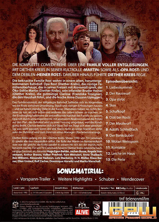 Die komplette Comedy-Reihe über eine Familie voller Entgleisungen. Mit Diether Krebs in seiner Kultrolle >Martin< sowie als >Opa Rost< und dem debilen >Heiner Rost<. Darüber hinaus führte Diether Krebs Regie. Die beknackte Familie Rost wohnt in einem alten, heruntergekommenen Bahnhof: Opa Rost (Diether Krebs), das rüstige Familienoberhaupt, das in seiner Freizeit mit Atommüll spielt, der Öko-Softie Martin (Diether Krebs), sein infantiler Bruder Heiner (Diether Krebs), die gutmütige Clarissa (Franziska Troegner), die den Haushalt führt, und die fesche Anna (Susann Uplegger). Die Familie Rost lebt in einem stillgelegten und heruntergekommenen Bahnhof im Nirgendwo zwischen Unordnung, Staub und rostigen Erfindungen - und sie haben ständig Ebbe in der Kasse. Obendrein haben sie nichts Besseres zu tun, als sich selbst und anderen das Leben schwer zu machen. Jeder Eindringling bekommt die entwaffnende Naivität der Familie zu spüren. Opa ruft durch seine Experimente mit atomarem Reaktormaterial die Polizei auf den Plan, der Bahnhof wird zu einer Festung umgebaut, weil die Kündigung droht, Clarissa bereitet sich auf Opas Tod vor, fragt sich aber gleichzeitig, was wohl passiert, wenn der alte Mann nicht an seiner Krankheit stirbt, oder der Bahnhof wird zum Zentrum eines Manager-Überlebenstrainings.