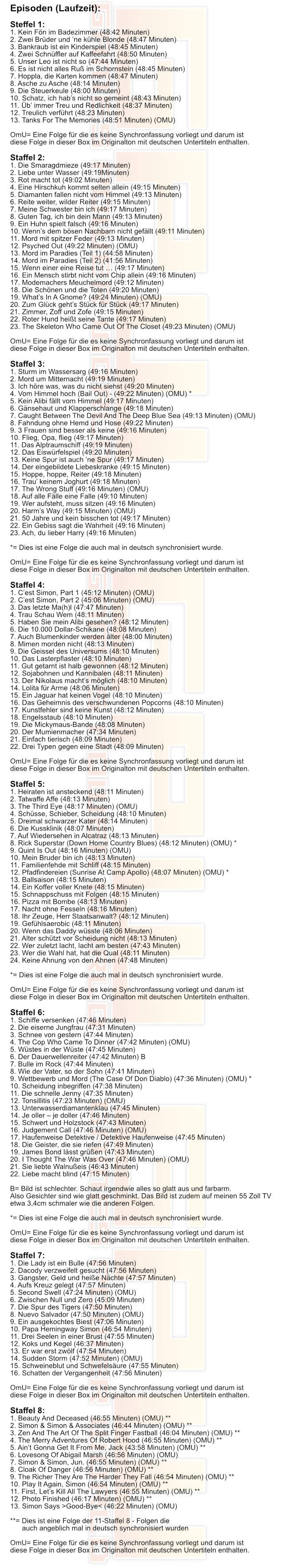 Die ARD sagt zur Staffel 8 aber, dass eine Synchronfassung nie angefertigt wurde. Vereinzelt wurden ggf. 1-2 Folgen in Originalton mit Untertiteln gezeigt. Dieses Material ist aber nach Lizenzende ebenfalls vernichtet worden. Dies geschah schon vor 20-25 Jahren und keine einzige ARD-Tochter hat Material aufbewahrt. Also wenn es jemals zur Staffel 8 eine Synchro gegeben hätte, wäre diese zumindest in der ARD-Datenbank, die alle Töchter nutzen, vermerkt gewesen. Dort ist aber zur Staffel 8 nie Sende-Material mit Synchro geschweige denn deutsche Episodentitel vermerkt gewesen.