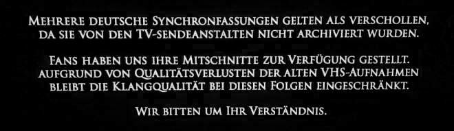 Die auf dieser Blu-ray-Box verwendeten deutschen Tonspuren stammen also aus diversen Privaten Quellen und liegen deshalb in unterschiedlich hoher Qualität vor. Bedeutet also es kamen für verschiedene „verschollene“ Episoden Fan-Aufnahmen von VHS, Betamax, Tonband sowie Video 2000 für diese Box zum Einsatz.