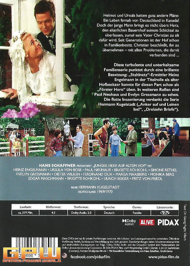 Junger Herr auf altem Hof Junger Herr auf altem Hof auf DVD von Pidax, ist bei Pidax jetzt erhältlich und im Handel ab 12. Februar 2026. Ihr bekommt mit dieser Junger Herr auf altem Hof - Box jetzt dank Pidax alle 13 Folgen der Familienserie mit Heinz Engelmann als Christian Grothe, Ursula von Bose als Else Grothe, Paul Neuhaus als Helmut Grothe, Simone Rethel als Brigitte Grothe, Brigitte Rohkohl als Helga Grothe und Evelyn Gressmann als Ursula Bentheim, jetzt erstmals auf 2 DVDs zu sehen. >> Junger Herr auf altem Hof (2 DVDs) hier kaufen << Produktinformation: