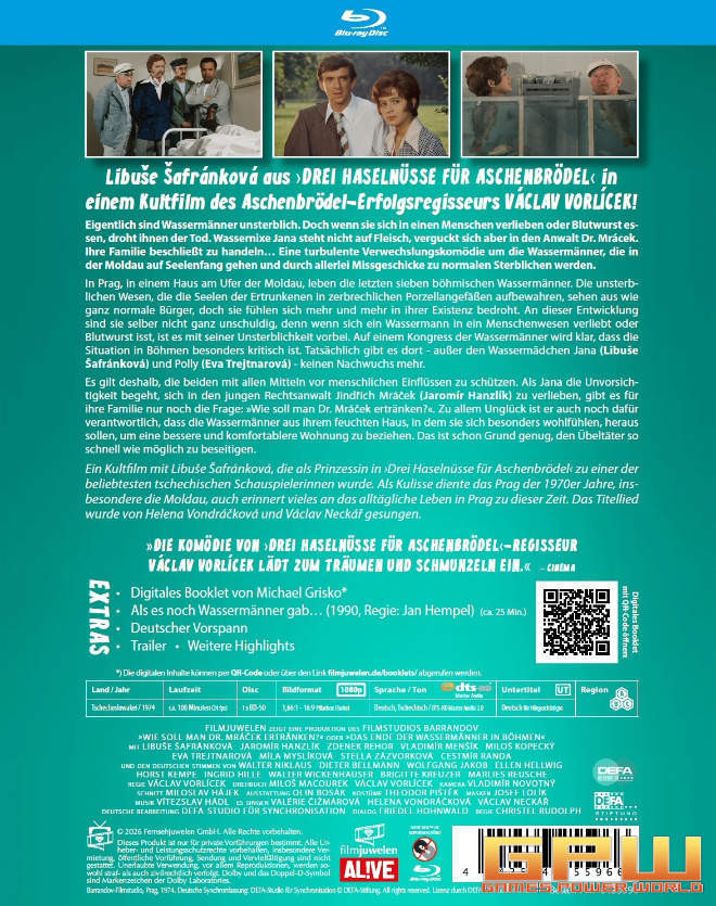 Wie soll man Dr. Mráček ertränken? oder Das Ende der Wassermänner in Böhmen Wie soll man Dr. Mráček ertränken? oder Das Ende der Wassermänner in Böhmen (Jak utopit doktora Mráčka aneb Konec vodníků v Čechách) auf DVD und Blu-ray von Fernsehjuwelen, ist ab 19. März 2026 erhältlich. Dank Fernsehjuwelen bekommen wir Wie soll man Dr. Mráček ertränken? oder Das Ende der Wassermänner in Böhmen (Jak utopit doktora Mráčka aneb Konec vodníků v Čechách) den Kinderfilm von 1974 mit vielen sehr bekannten Schauspielern der Tschechoslowakei wie z.b. Libuše Šafránková als Wassermädchen Jana, Jaromír Hanzlík als Rechtsanwalt Jindřich Mráček, Vladimír Menšík als Karel Wässerlein, František Filipovský als Bertík Wässerlein, Vlastimil Hašek als Honza und Jiří Hrzán als Wassermann Thomas, jetzt erstmals ungekürzt in einer Neuauflage auf DVD und erstmals auch in HD auch auf Blu-ray zu sehen.