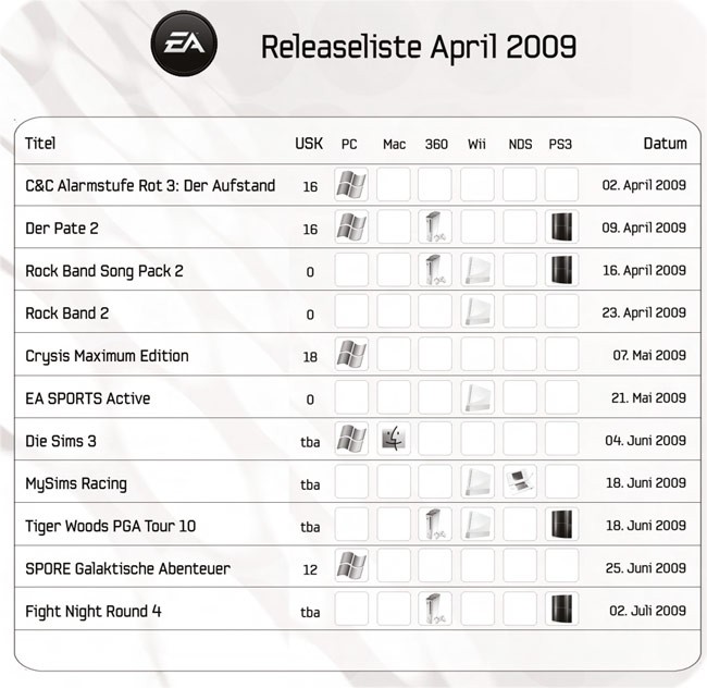 EA Releaseliste April 2009