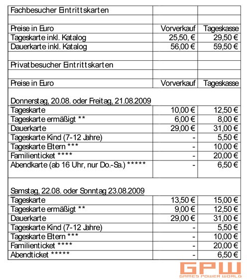 gamescom startet Karten-Vorverkauf: Der Online-Shop der gamescom, Europas neues Messe- und Entertainment-Highlight für interaktive Unterhaltung, ist ab sofort für Fachbesucher und Publikum geöffnet. Im Online-Shop ist der Kartenkauf ein Kinderspiel: Die E-Tickets können direkt nach erfolgreicher Registrierung und Bezahlung auf www.gamescom.de ausgedruckt werden. So ist der Eintritt, vorbei an den Ticketschaltern vor Ort, einfach und effizient. Zusätzliches Anstehen an der Kasse entfällt. Und das Beste: die Eintrittskarte aus dem Online-Shop zur gamescom ist im Vorkauf bis zu 25 Prozent günstiger. Gleichzeitig ist sie Fahrausweis im öffentlichen Personennahverkehr des Verkehrsverbundes Rhein-Sieg (VRS) und des VRR (Verkehrsverbund Rhein-Ruhr). Bereits ab 6 Euro im Vorverkauf können Schüler, Studenten und Gamer die Premiere der gamescom vom 20.- 23.August 2009 in Köln erleben. Da die gamescom alle Zielgruppen der interaktiven Unterhaltung vereint, von Intensivspielern bis hin zur wachsenden Gemeinde der „Casuals“, erhalten Eltern, die mit bis zu drei Kindern die gamescom besuchen, dank des Familientickets ebenfalls Eintritt in die Welt der interaktiven Unterhaltung. Fachbesucher-Tickets liegen im Vorverkauf bei 25,50 Euro. Den Online-Shop für Fachbesucher finden Sie hier: www.gamescom.de Mit Businesscenter und Entertainmentarea auf dem Messegelände sowie dem gamescom-Festival in der Stadt wird die gamescom vom 19. – 23.August 2009 (19.08.2009 exklusiver Fachbesucher- und Medientag) einen neuen Level an Unterhaltung für die gesamte europäische Games-Community bieten. Während in den Hallen 4 und 5 die Industrie ihre Kontakte pflegt und Geschäfte abschließt, stehen in den modernen Nordhallen 6 bis 9 des Kölner Messegeländes Entertainment und die neuesten PC- und Videospiele im Vordergrund. Online- und Offline wird die gesamte Palette interaktiver Unterhaltung geboten. Also am besten schon heute Tickets sichern. Weitere Informationen zur gamescom – dem Messeund Eventhighlight der internationalen interaktiven Unterhaltungsindustrie – finden Sie unter www.gamescom.de. oder www.gamescom-cologne.com. Die Ticketpreise im Überblick: * Erklärungen zu den einzelnen Preisen finden sich im Online-Shop.