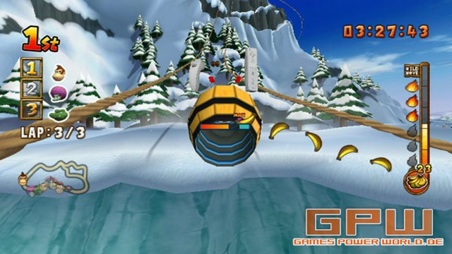 Die Affen rasen durch den Wald. Und noch nie war Nintendos Spaß-Gorilla Donkey Kong schneller und witziger als in seinem Debütspiel für die Heimkonsole Wii. Am 25. Januar fällt der Startschuss für Donkey Kong Jet Race. Ein Fun-Rennspiel, in dem sich bis zu vier Spieler irre Wettrennen liefern können. In drei Schwierigkeitsgraden geht es über nicht weniger als 16 verschiedene Pisten: mal quer durch den Dschungel, die Wüste oder den Ozean, mal über Berge und Gletscher, durch einen Tempel oder durchs Weltall, um nur einige Schauplätze zu nennen.
