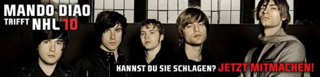 Ab Mitte Oktober tourt die schwedische Band Mando Diao durch Deutschland und EA SPORTS bringt den Spieler mit NHL 10 so nah an die Band, wie es sonst niemandem gestattet sein wird. EA verlost Tickets für zwei Personen für ein Konzert inklusive Meet & Greet mit der Band bei einer Partie NHL 10. Schlägt der Spieler die Eishockey-Fans Mando Diao im Duell auf der virtuellen Eisfläche erhält der Teilnehmer eine signierte Gibson-Gitarre. Für die Bewerbung stehen die folgenden Tourdaten zur Verfügung: Weitere Informationen zu EA SPORTS NHL 10 unter www.easports.de.