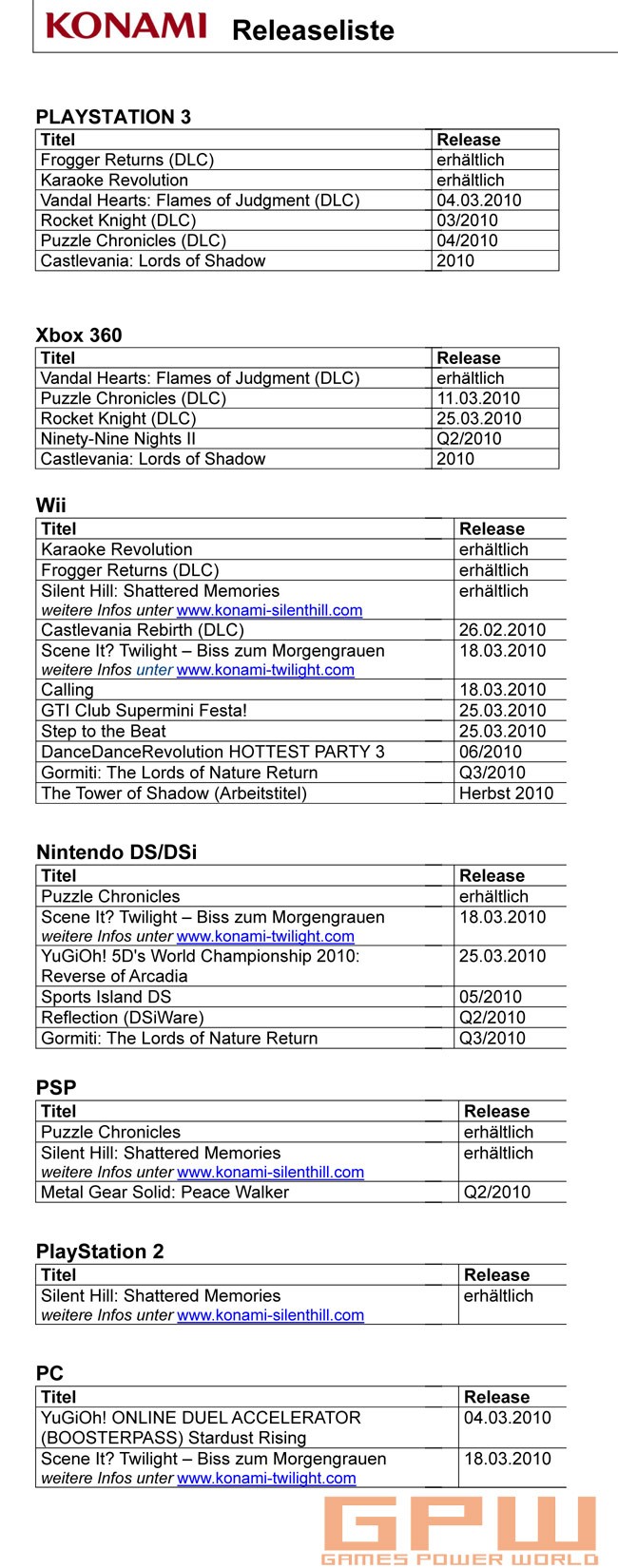 Aktuelle Konami-Releaseliste