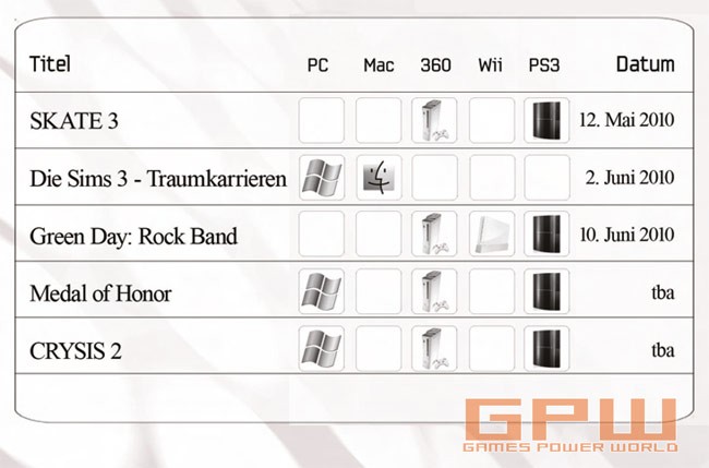 Electronic Arts-Releaseliste Mai 2010 Aktuelle Releaseliste aus dem Hause ELECTRONIC ARTS für den Monat Mai 2010. Das Highlight im Mai: SKATE 3 legt den Schwerpunkt auf das Koop-Erlebnis eines Skater-Teams. Der Spieler baut das perfekte Team auf und drückt dem brandneuen Skater-Paradies Port Carverton den persönlichen Stempel auf. Der Titel bietet neue Team-Herausforderungen und online misst man sich mit rivalisierenden Crews und erobert die Straßen der Stadt. In SKATE 3 ist außerdem die Kreativität des Spielers gefragt - auf dem Board und abseits des Boards. Mit Skate.Create können individuelle Inhalte für das eigene Team erstellt und mit der ganzen Welt geteilt werden. Mit dem brandneuen Editor Skate.Park lassen sich eigene Parcours erstellen. Die Funktion Skate.Reel macht es möglich, die am besten gelungenen Tricks des Teams zu filmen und online zu veröffentliche