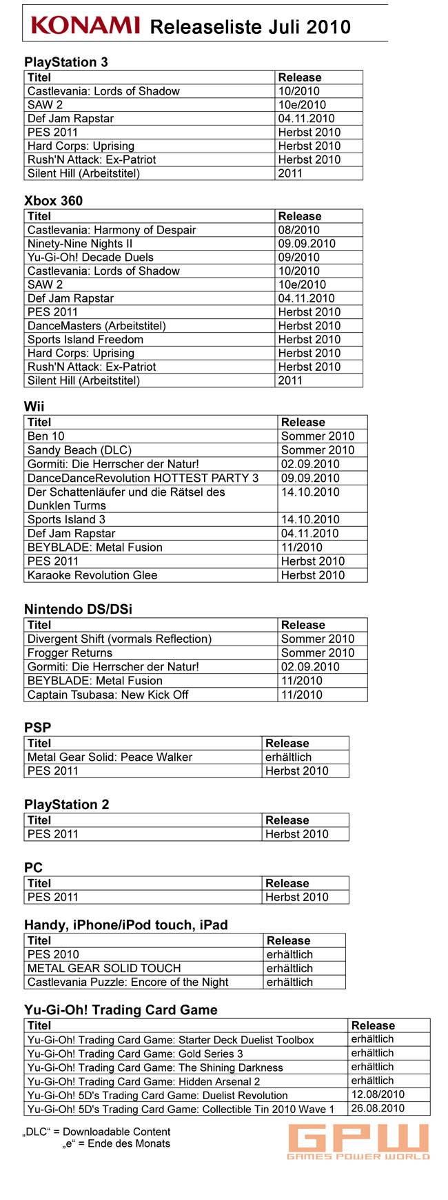 Aktuelle Konami-Releaseliste für Juli 2010.