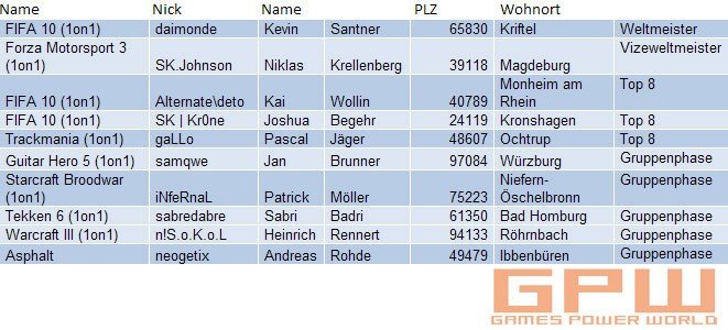 Deutschland wird Weltmeister in Los Angeles Los Angeles/Groß-Gerau, 4. Oktober 2010 - Mit Gold in der Fußballsimulation FIFA auf dem PC und Silber im Rennspiel Forza Motorsport auf der Xbox 360 positioniert sich Deutschland im Medaillenspiegel bei der Weltmeisterschaft der Computerspieler in Los Angeles auf dem zweiten Platz hinter Korea. Trotz Lospech konnte die deutsche Nationalmannschaft beim Weltfinale der World Cyber Games am Wochenende in Los Angeles am Ende dennoch jubeln: Kevin „daimonde“ Santner aus Kriftel konnte nach seinem Triumpf im Viertelfinale gegen den deutschen Titelverteidiger Joshua „Kr0ne“ Begehr aus Kronshagen im Finale gegen den Chinesen Zheng Yangin gewinnen. Damit bleiben Weltmeistertitel und Goldmedaille in der Disziplin FIFA in Deutschland. Unglücklich für die drei deutschen FIFA-Spieler: Alle wurden in denselben Turnierbaum gelost, so dass sie sich in deutschdeutschen Duellen gegenseitig aus dem Turnier nehmen mussten. Nach einem denkbar knappen Finale muss sich Niklas „Johnson“ Krellenberg aus Magdeburg mit der Silbermedaille in Forza Motorsport 3 begnügen. Mit jeweils einer halben Sekunde Rückstand in den Finalrennen musste sich Krellenberg dem Engländer David Kelly geschlagen geben – erzielt aber mit dem Titel des Vize-Weltmeisters dennoch das beste Ergebnis seiner fünfjährigen Profi-Computerspieler Karriere. Auch beim zweiten Rennspiel Trackmania lief es für den deutschen Piloten Pascal „gaLLo“ Jäger aus Ochtrup zunächst ausgezeichnet und der amtierende deutsche Meister konnte sich bis ins Halbfinale fahren. Dort traf er auf Weltmeister Kalle Mortlund Videkull aus Schweden und den Vizeweltmeister Peter Strele aus Österreich und musste sich nur den beiden besten Trackmania Spielern der Welt geschlagen geben. In Guitar Hero 5 musste sich der deutsche Vertreter Jan „samqwe“ Brunner aus Würzburg bereits in der Gruppenphase dem Vizeweltmeister George Boothby aus dem Vereinten Königreich stellen, der für ihn nicht zu bezwingen war. Auch die weiteren deutschen eSport Profis mussten sich schon relativ früh geschlagen geben. „Wir sind stolz auf unser Team“, resümiert Thomas von Treichel, Marketing Director beim Ausrichter der World Cyber Games in Deutschland, Advanced Cyber Entertainment. „In FIFA hatten wir leider kein Losglück, so dass der Traum von einem deutschen Finale wie im letzten Jahr nicht in Erfüllung gehen konnte und in Forza Motorsport zeigte sich wie groß die Leistungsdichte war, denn trotz fehlerlosem Rennen hat es nicht ganz für Gold gereicht. Das ganze Team hat großen Zusammenhalt und starke Spiele gezeigt und wir sind mit dem Ausgang des Weltfinales alles in allem sehr zufrieden.“ Mit den Erfolgen in Los Angeles konnte Deutschland in der ewigen Tabelle den zweiten Platz hinter Korea verteidigen und den Vorsprung vor den USA ausbauen. Die Platzierungen im Einzelnen: