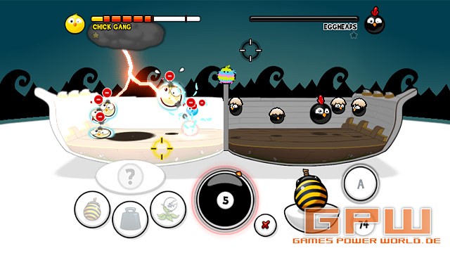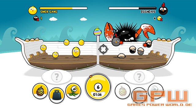chick chick BOOM erscheint am 29. Oktober im Wii-Shop-Kanal! Das Spiele-Entwicklungs-Team tons of bits hat von Nintendo die endgültigen Daten zum Release vom Erstlingswerk chick chick BOOM für WiiWare mitgeteilt bekommen: chick chick BOOM erscheint am 29. Oktober 2010 im Wii-Shop-Kanal. Der Preis wurde auf 800 Wii Points festgesetzt. Außerdem gibt es auf der offiziellen Webseite in der "Media"-Sektion ein neues Ingame-Video für die Schiff Arena: www.chickchickboom.com. Des Weiteren findet man in der "Das Spiel"-Sektion jetzt auch eine Übersicht über die Teams. Wir freuen uns schon auf nächste Woche :) Ihr habt Fragen zu chick chick BOOM?, bei uns im Forum habt ihr die Möglichkeit auf Fragen eine Antwort von einen der Spiele-Entwickler zu erhalten Es gibt 2 Teams mit je 5 Küken. Auf jeder Seite der Arena befindet sich je ein Team. Aufgabe ist es alle gegnerischen Küken zu erledigen. Dafür verwendet man ein Kernelement des Spiels: die Attacken. Der Spieler hat die Wahl zwischen 3 Basisattacken (Bombe, Gewicht, Pflanze), einer Blitz-Attacke (nur verfügbar, wenn eine dunkle Wolke am Himmel erscheint) und einer Spezial-Attacke, die sich je nach Setting unterscheidet (UFO in der Stadt, Seemonster auf dem Schiff, Geist im Spukwald). Jede Attacke kann man mit je 2 Upgrades verstärken, z.B. wird beim höchsten Upgrade aus einem gewöhnlichen Gewicht ein riesiges Sumo-Küken, daß sogar zweimal auf die gegnerische Seite springt. Insgesamt gibt es also 7 verschiedene Attackentypen mit nochmal je 2 Upgrades, also insgesamt 21 unterschiedliche Attacken. Ein weiteres Kernelement ist die Verteidigung. Man vertwidigt, indem man mit der Wii-Fernbedienung Linien in die Arena zeichnet. Das funktioniert ganz intuitiv und logisch. Wenn z.B. ein Gewicht vom Himmel fällt, zeichnet man eine horizontale Linie über den Köpfen der Küken, so fällt das Gewicht auf die Linie und wird geblockt. Da die Küken auch mit der Linie kollidieren, kann man sie z.B. mit einer Linie in einer Ecke "festhalten", wodurch sie der Gefahrenquelle fern bleiben. Man kann auch die gegnerische Verteidigung sabotieren, indem man mit der eigenen Linie die des Gegners blockt. Es gibt weitere Features, wie z.B. den Corncobman und der Piñata. Corncobman ist ein großer Maiskolben, der im Hintergrund vorbeiläuft und dessen Maiskörner man vom Körper schiessen kann. Die Maiskörner werden dann von den Küken gegessen und somit geheilt. Schießt man auf die Piñata, erhält man einen Bonus (Linien Upgrades, Küken Upgrades, Gegner Störung). Durch die Dynamik der andauernd hüpfenden Küken und der frei zeichenbaren Verteidigungs-Linie entsteht so ein Gameplay, daß immer wieder neue Situationen und Reaktionen hervorruft. Beschreibungs-Text (erscheint im Wii Shop Channel) Fünf Küken auf deiner Seite, fünf Küken auf der anderen. BOOM! Besiege das gegnerische Küken-Team, aber nicht einfach nur so! In chick chick BOOM wirfst du mit alten Klavieren, rosa Elefanten und Sumo-Küken oder rufst schleimige Riesenquallen und echte UFOs herbei. Zeichne Linien in die Arena, um gegnerische Attacken abzuwehren - es kommt auf Tinte, Kreativität und Timing an! Weitere Unterstützung bekommst du von einem Maiskolben und einer Piñata. Echt jetzt! Spiele alleine oder mit Freunden – zusammen oder gegeneinander! Für Abwechslung sorgen dabei mehrere Spielmodi und unterschiedliche Arenen mit ihren Spezial-Attacken. Features: Technische Info: