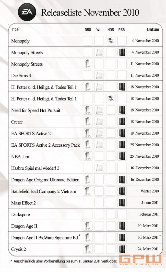 Hier ist die aktuelle Releaseliste aus dem Hause Electronic Arts für den Monat November 2010. Es sind alle Neuerscheinungen der nächsten Monate aufgelistet.